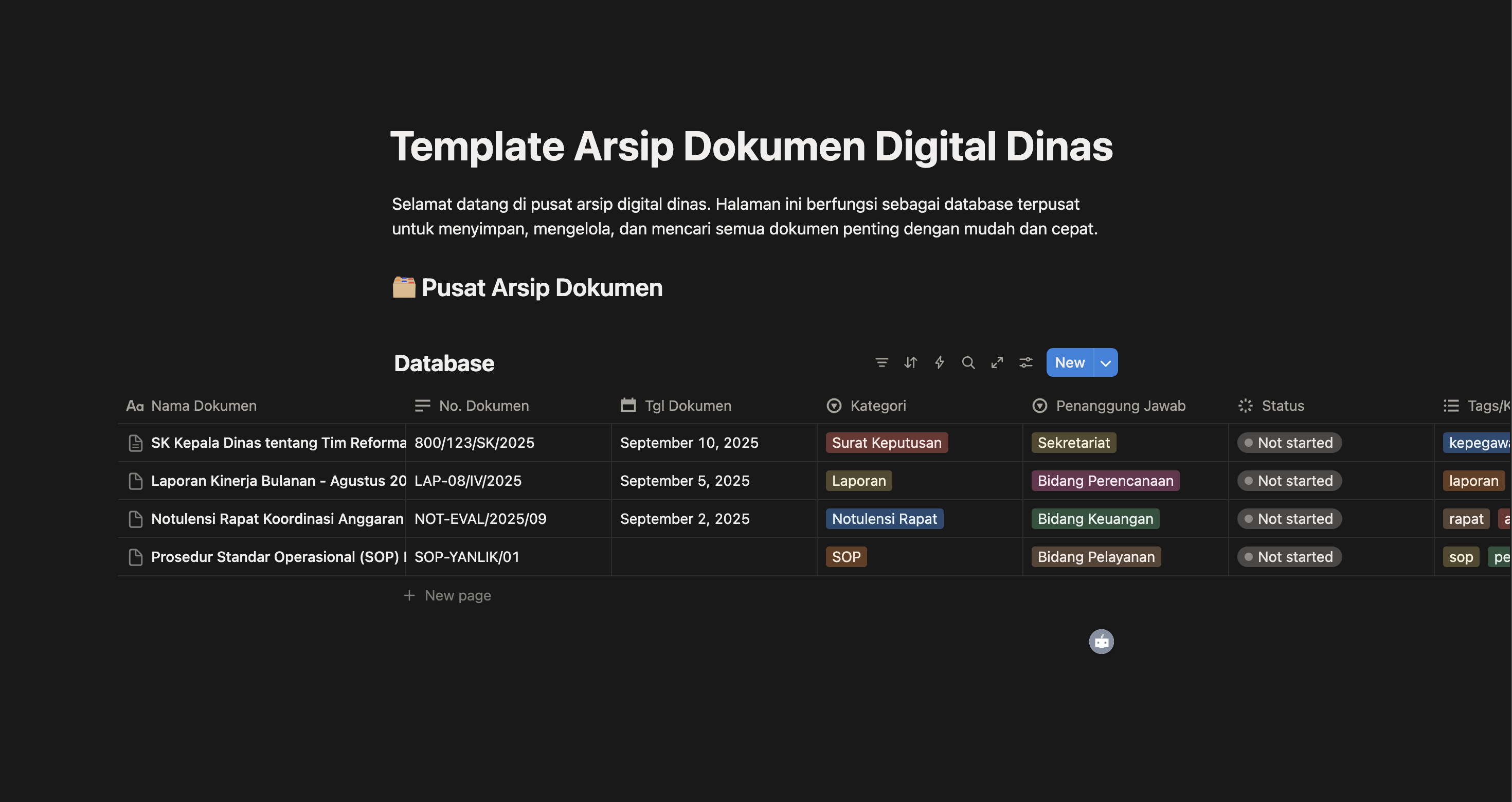 Template notion untuk membuat direktori pegawai instansi pemerintah/organisasi. Semua data pegawai tersusun rapi dalam satu database dengan kolom: NIP, jabatan, unit kerja, pangkat/golongan, status, lokasi, kontak, hingga keahlian.Â